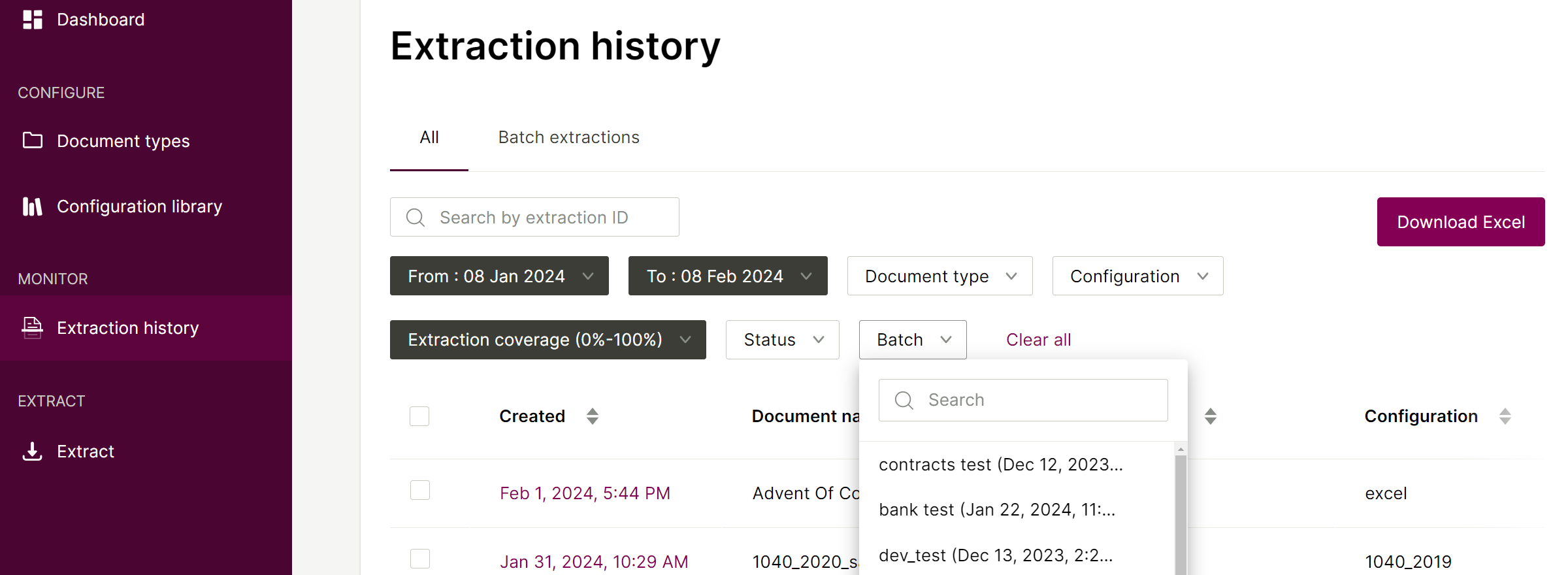 In the Sensible app, you can now filter past extractions by batch description or by batch upload date-time. Sensible creates a batch when you use the Extraction tab to upload multiple files at once for extraction.