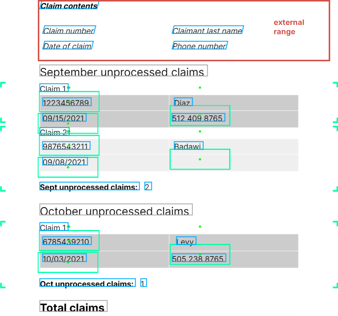 For sections that lack internal anchoring text, you can now specify anchoring text anywhere in the document using the new External Range parameter. For example, in the following screenshot, the green brackets denote sections, where each section is a claim. The labels for the claims’ content are at the start of the document, under the Claims contents heading, so you can define an external range to anchor on these labels.