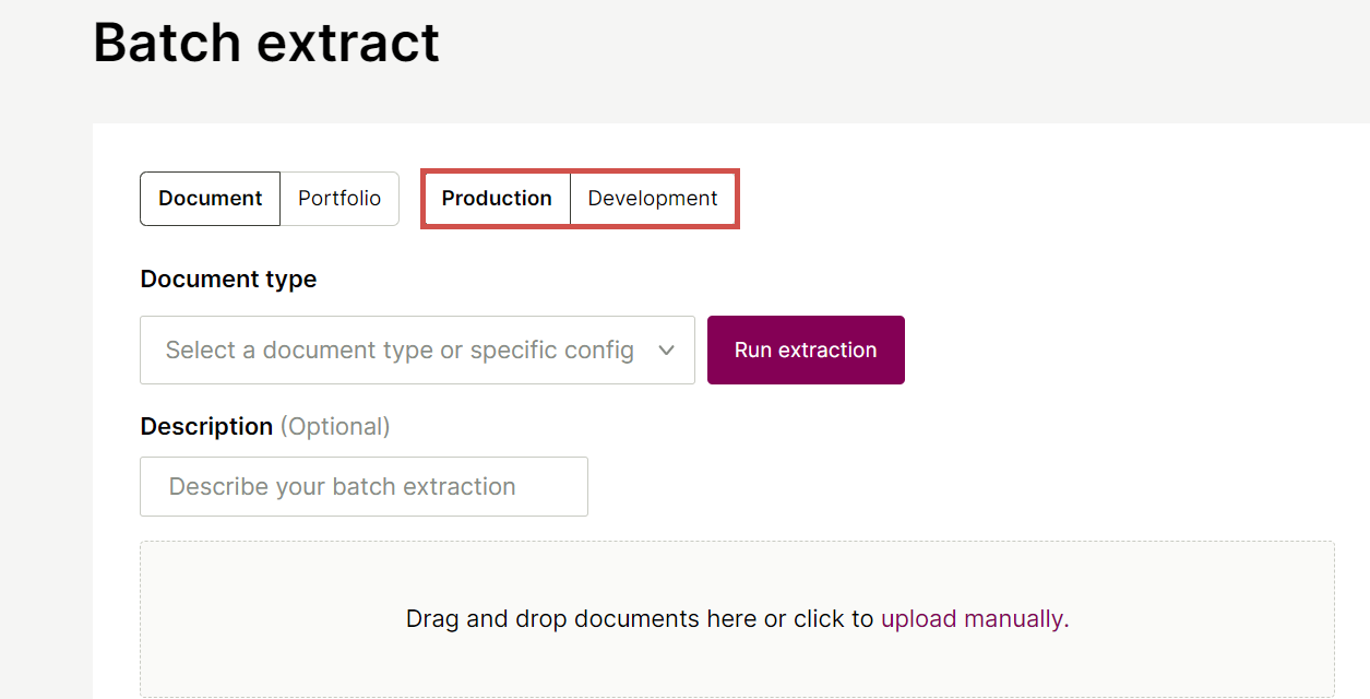 In addition to specifying environments through the SDK or API for portfolio and batch extractions, you can now do so in the Sensible app’s Extraction tab. When you select multiple files to upload for extraction, choose Production or Development: